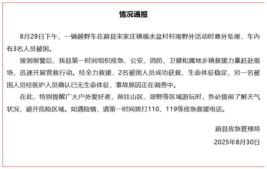 【越野车意外坠崖,河北张家口通报】8月30日,河北省张家口市蔚县应急管理局发布情况通报: