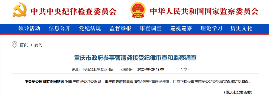 【重庆市政府参事曹清尧被查】据重庆市纪委监委消息:重庆市政府参事曹清尧涉嫌严重违纪违法,目前正接受重庆市纪委监委纪律审查和监察调查。