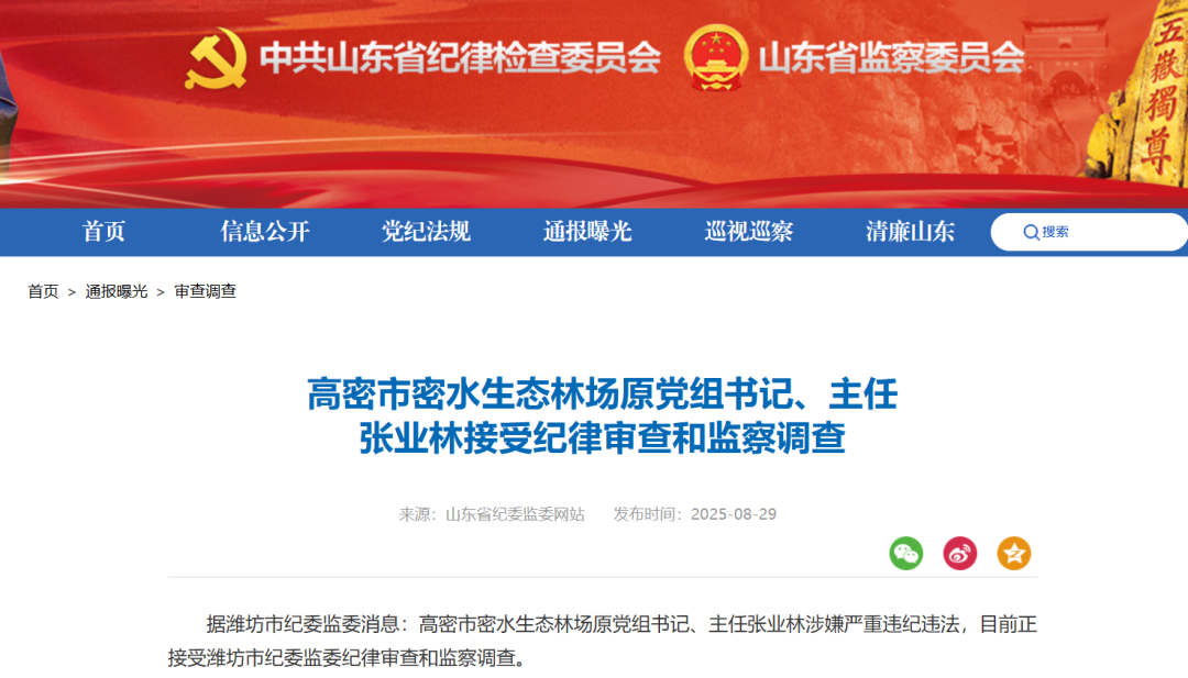 【山东省纪委监委通报,张业林被查】山东省纪委监委通报:据潍坊市纪委监委消息,高密市密水生态林场原党组书记、主任张业林涉嫌严重违纪违法,目前正接受潍坊市纪委监委纪律审查和监察调查。
