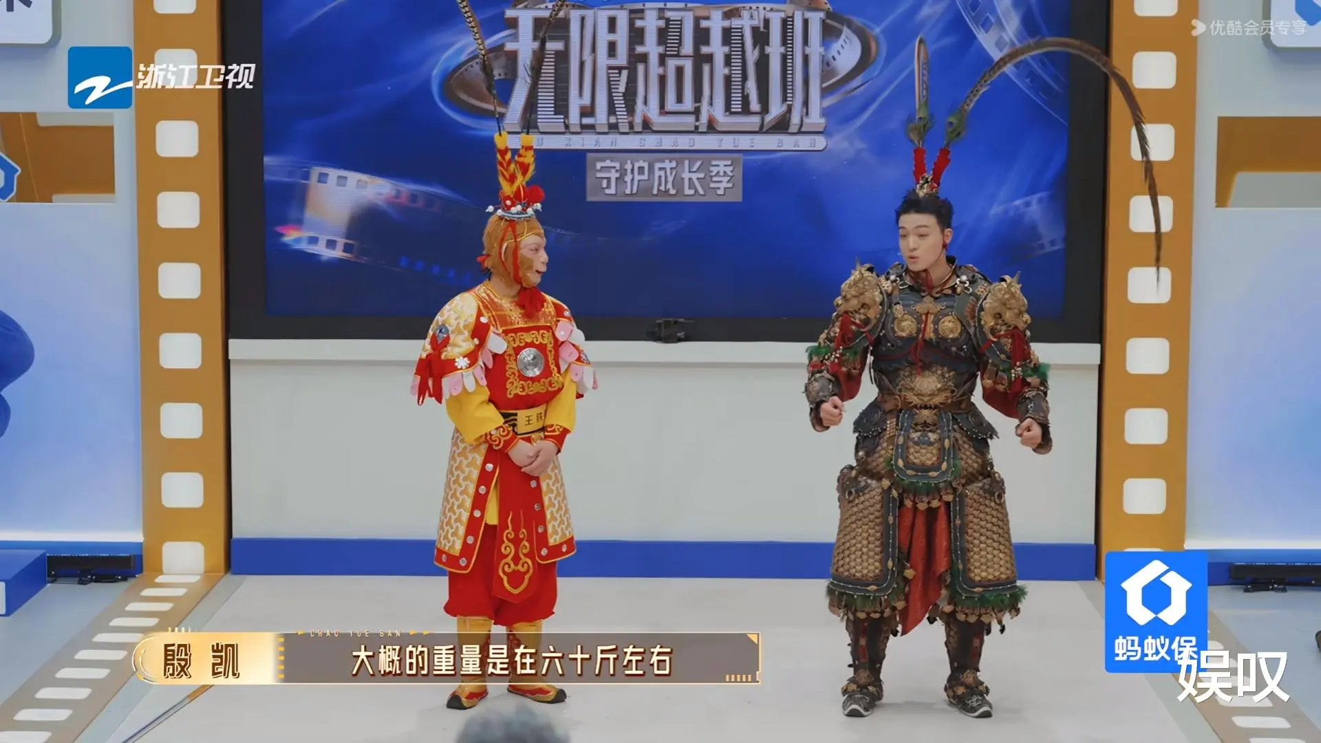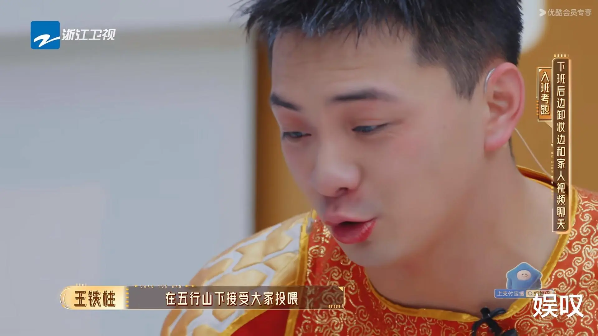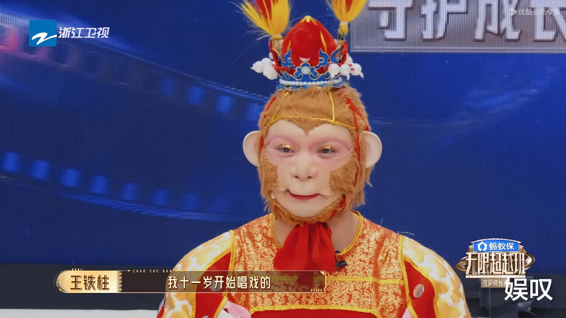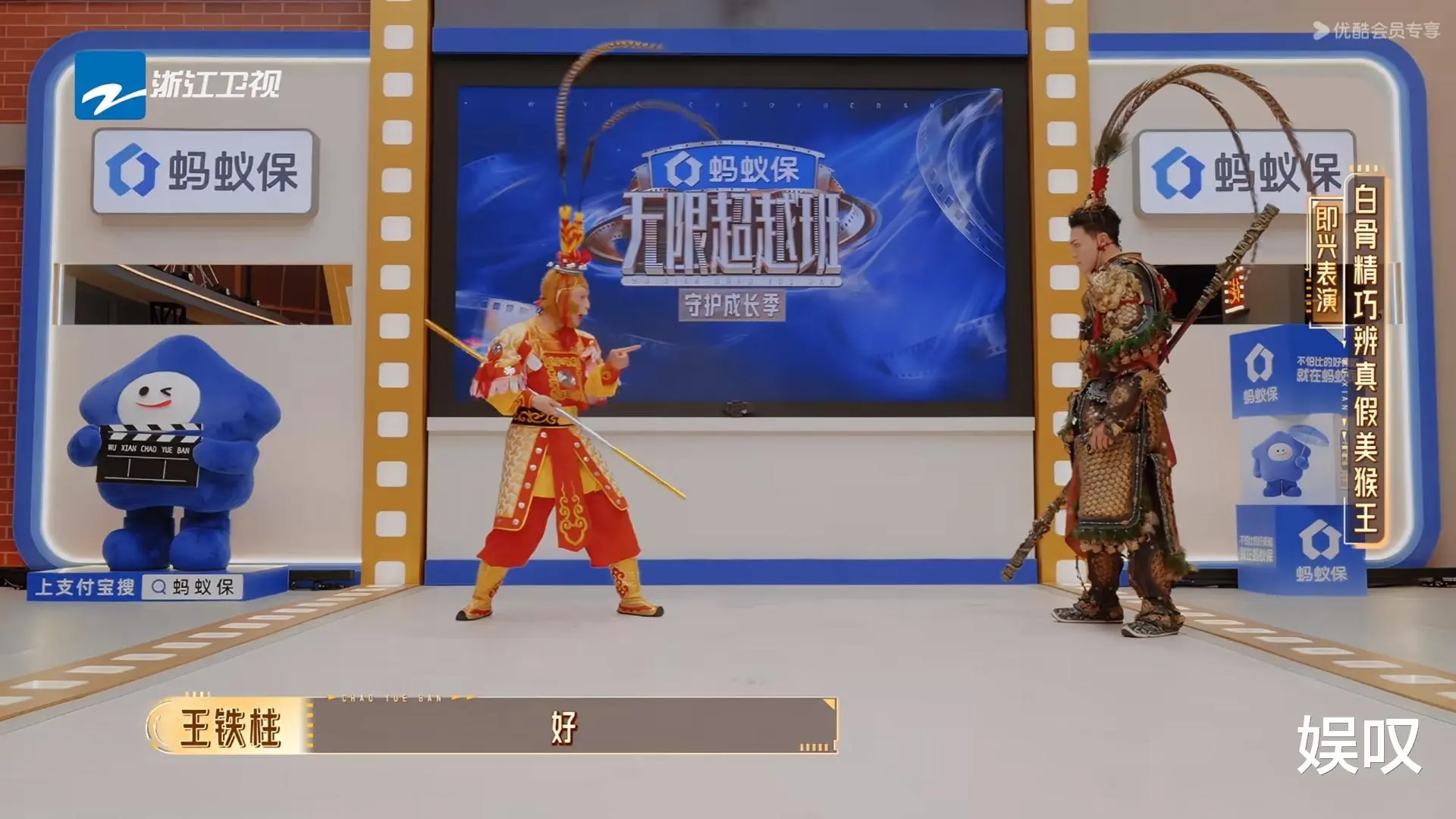 王铁柱的出场就自带故事感。他和同样演黑神话悟空的殷凯同台,以“真假美猴王”亮相,耍金箍棒、翻跟头、下叉一气呵成,头上翎子意外脱落,他顺势接梗“妖怪露出破绽”,临场反应直接封神。